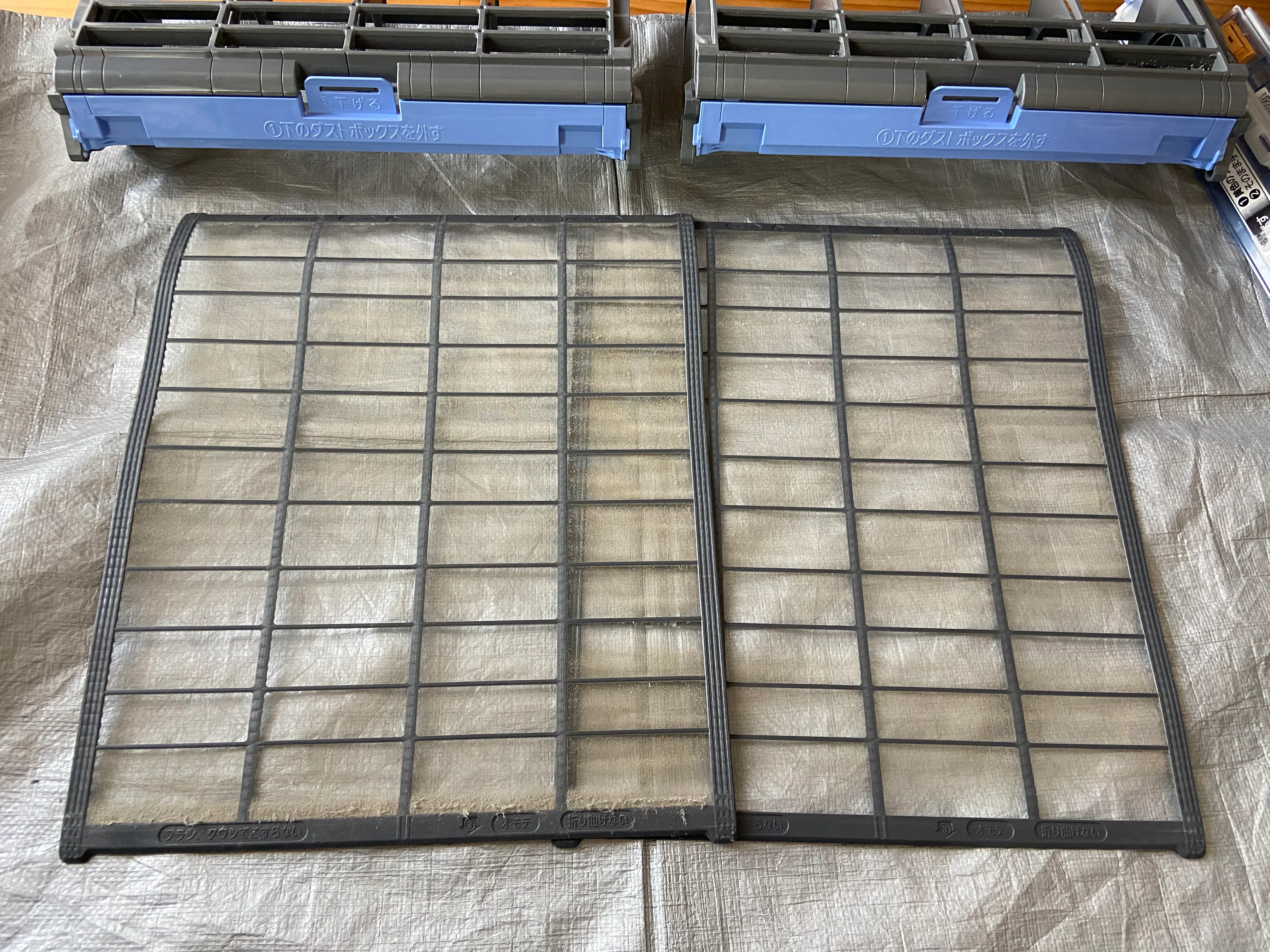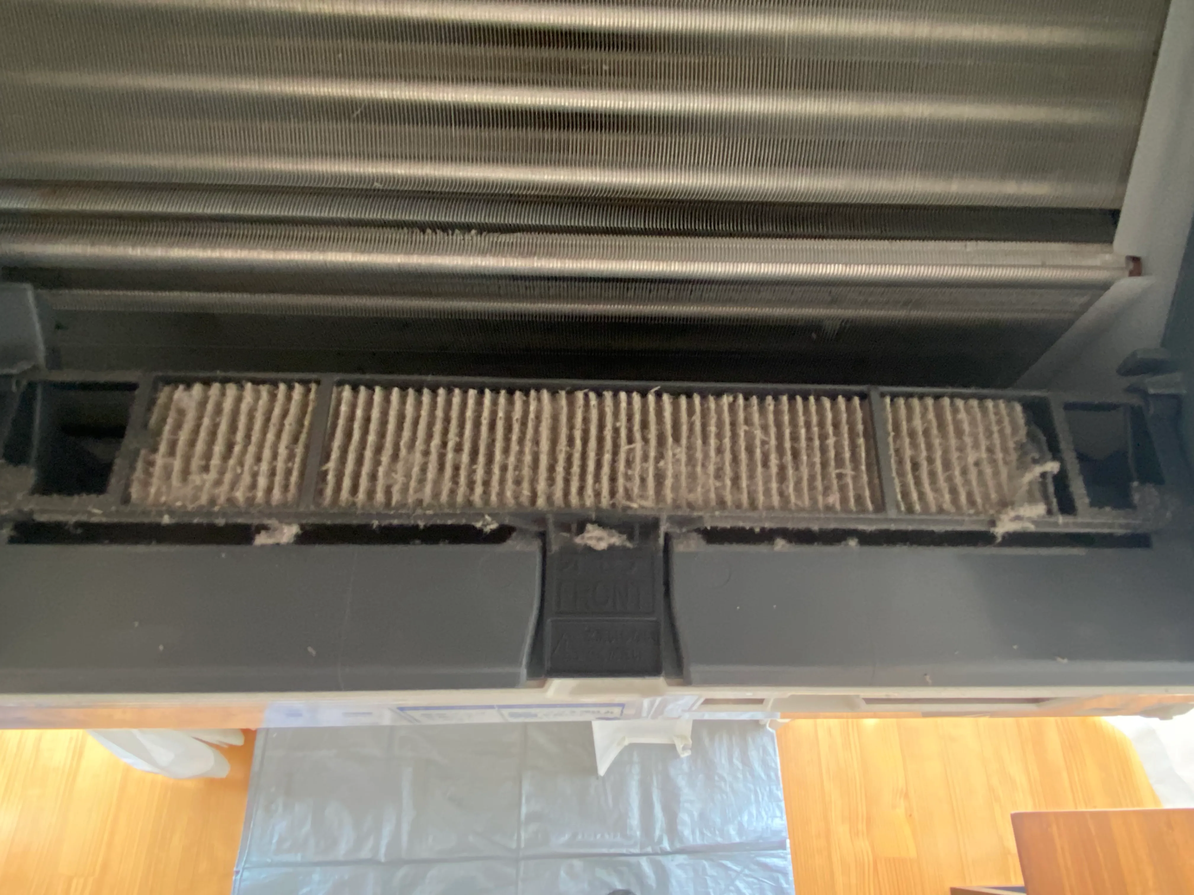 リビングのお掃除機能付きエアコンの帯電ミクロフィルターが結構汚れいていましたので、お客様へ相談して後日交換させていただきまいた。