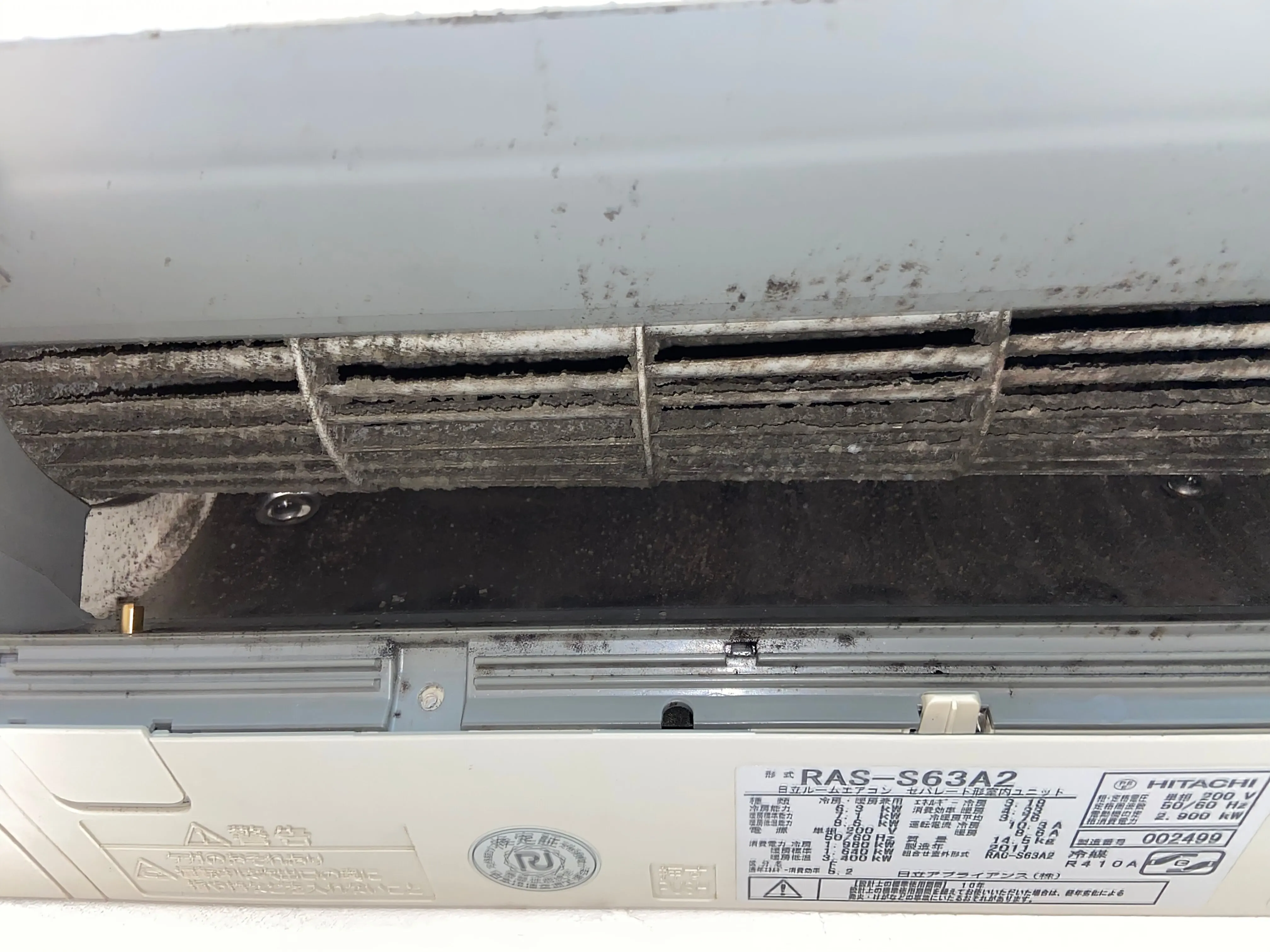リビングのエアコンは設置から10年以上が経過しており、送風口から覗くと、カビやホコリがびっしりと付着していました。