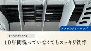 八代市北平和町でお掃除機能付きエアコン3台のクリーニングを実施。10年以上経過したエアコンや設置スペースが狭い機種にも対応し、内部のカビや汚れを高圧洗浄で除去しました。八代市周辺でエアコンクリーニングをご検討の方は山猫美掃舎へご相談ください。